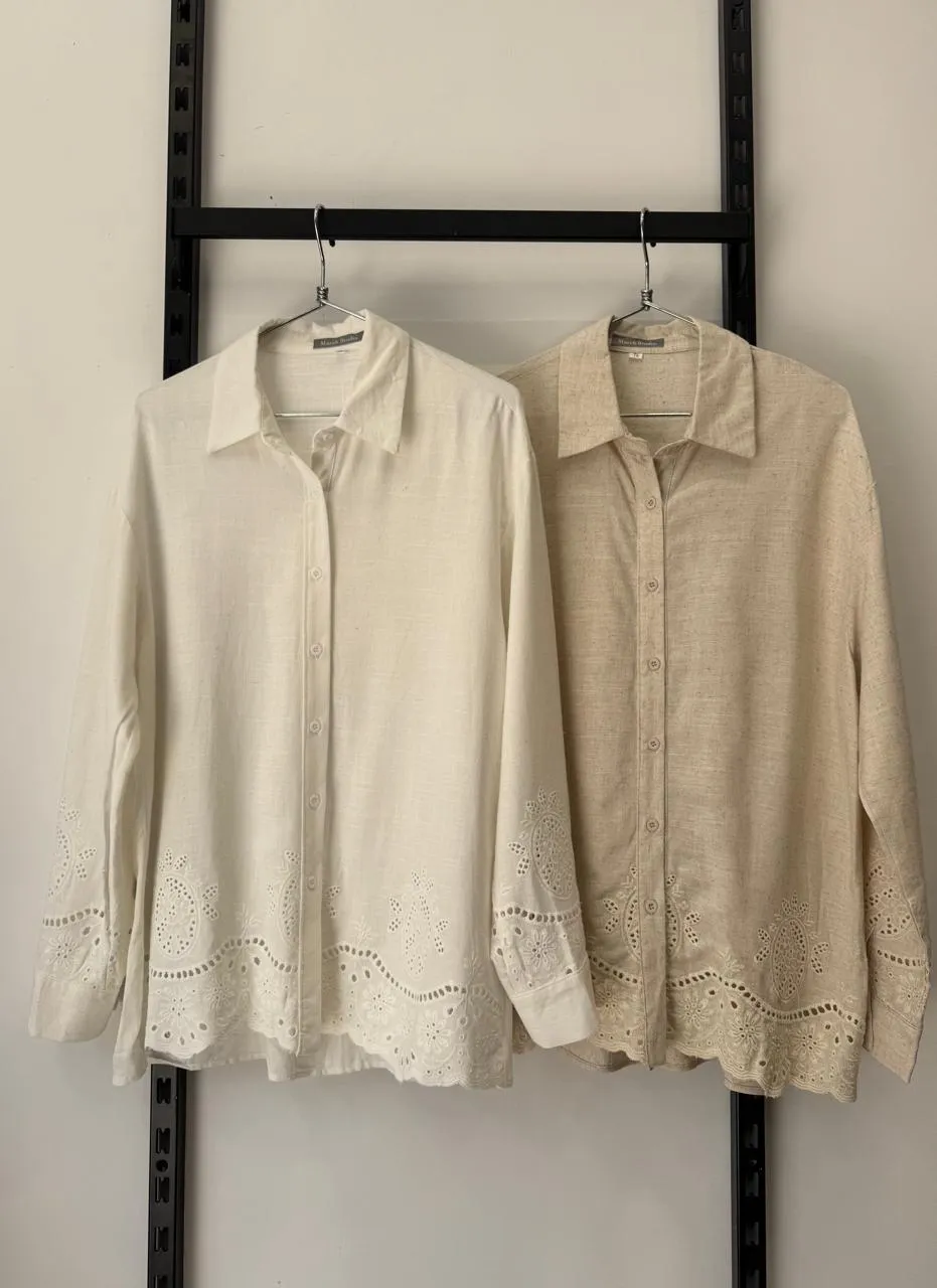 Raffiné et intemporel, ce chemisier en lin mélangé à manches longues est sublimé par une broderie anglaise délicate au bas et sur les poignets. Son col classique et sa coupe droite en font une pièce facile à associer, parfaite pour un look bohème chic ou élégant au quotidien. Léger et respirant, il convient parfaitement aux saisons printemps-été.